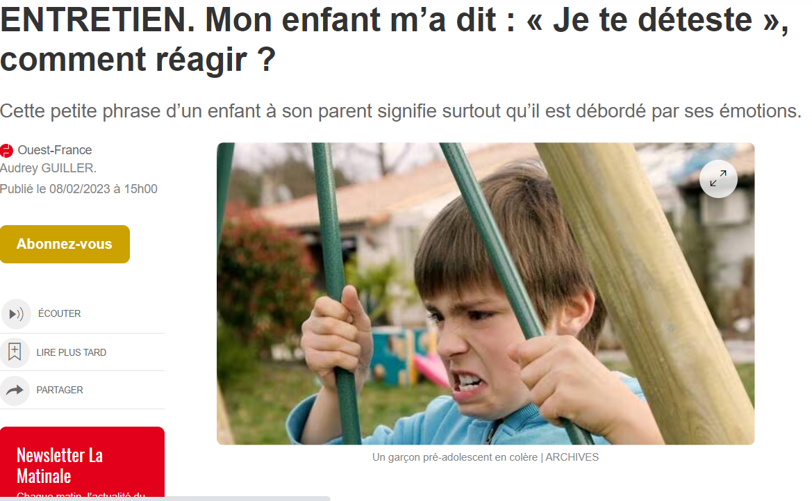 J'ai eu l'occasion de répondre aux questions de la journaliste Audrey Guiller pour le journal Ouest France dans un entretien portant sur le thème: "Mon enfant m’a dit : « Je te déteste », comment réagir ?" Vous pouvez découvrir l'intégralité de cet entretien en ligne : https://www.ouest-france.fr/education/parents-enfants/entretien-mon-enfant-m-a-dit-je-te-deteste-comment-reagir-e60ad0a4-a6ef-11ed-b736-470f48fa758b